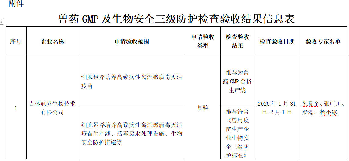 吉林省畜牧業管理局第69批獸藥GMP及生物安全三級防護檢查驗收結果公示
