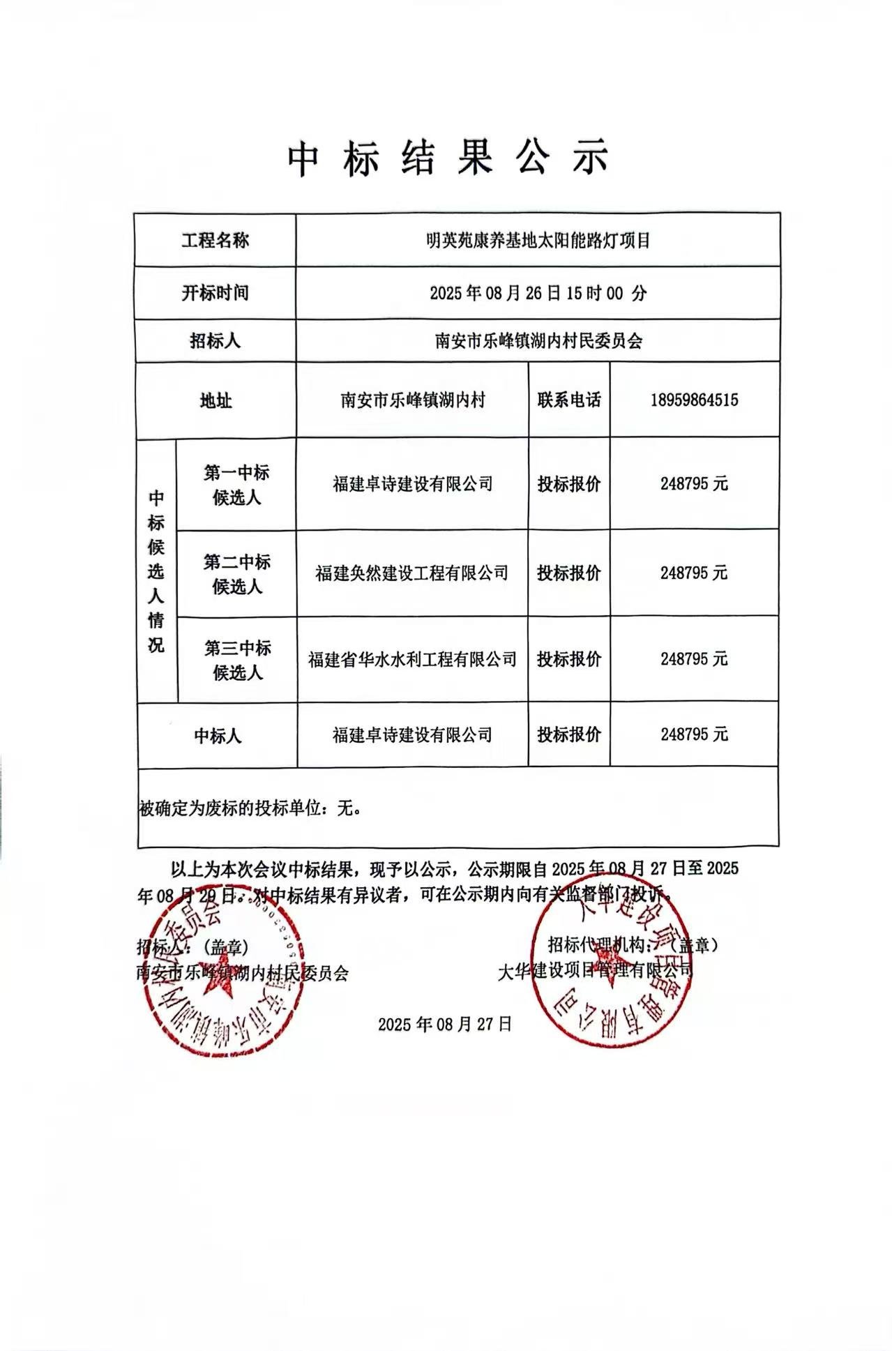 南安市樂峰鎮(zhèn)明英苑康養(yǎng)基地太陽能路燈項(xiàng)目的中標(biāo)結(jié)果公示