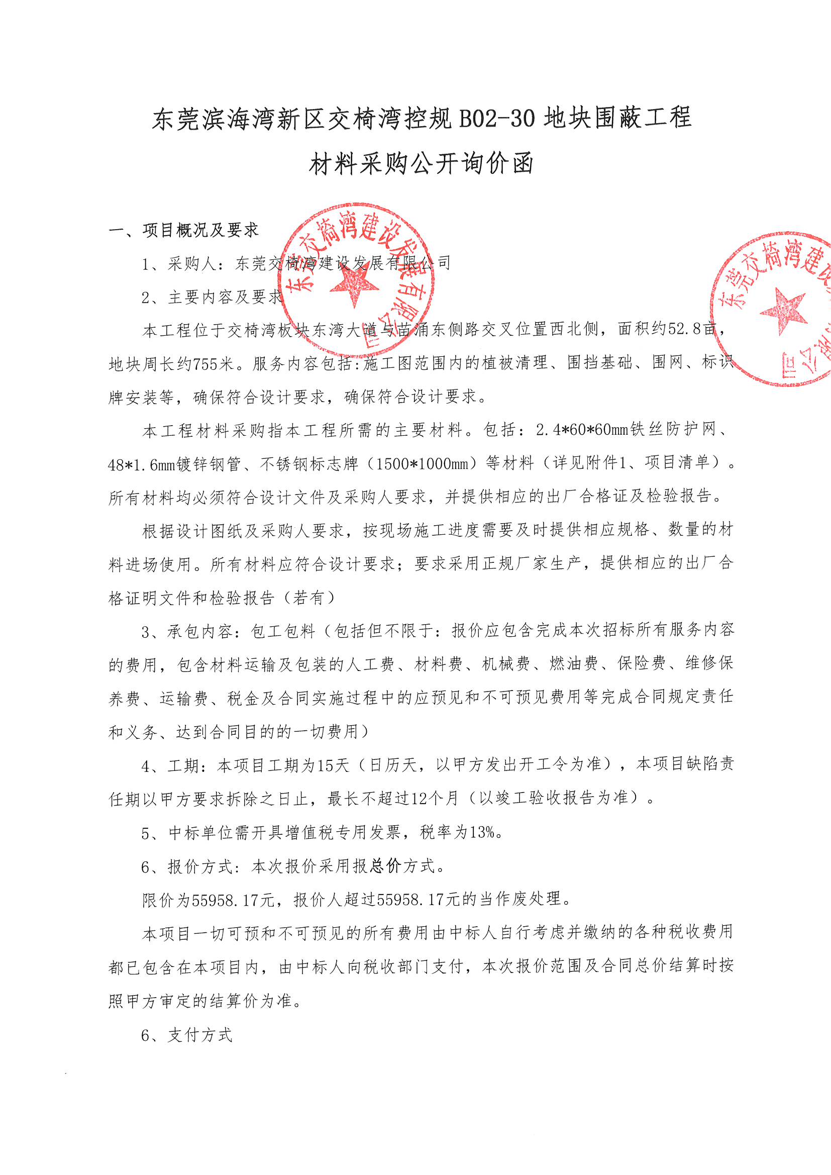 東莞濱海灣新區(qū)交椅灣控規(guī)B02-30地塊圍蔽工程材料采購公開詢價函